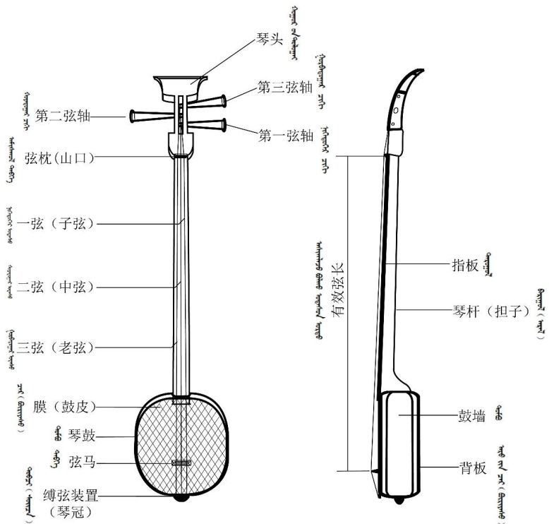蒙古三弦的部位结构见附录A,具体尺寸见附录B。